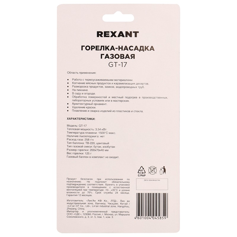 Горелка REXANT GT-17 – это надежное устройство, характеризующееся, экономичностью расхода топлива, низким уровнем шума, повышенной мощностью. Устройство воспроизводит стабильное пламя, не требует предварительного нагрева газа. Лучше всего подойдет для быстрого и экологичного поджига дров, угля. Предоставляет возможность получить контролируемый вид пламени, которым можно воспользоваться в процессе пайки, сварки, ремонта, в кулинарных целях.