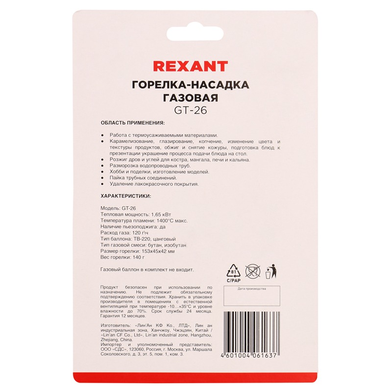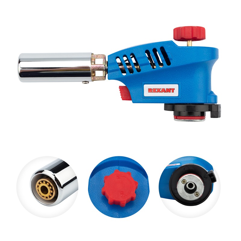 Горелка REXANT GT-26 безопасна в эксплуатации, экономична в расходе газовой смеси. Отличается наличием керамического обода внутри сопла, что позволяет горелке дольше работать непрерывно и при этом не перегреваться. Уровень пламени регулируется с помощью вентиля.