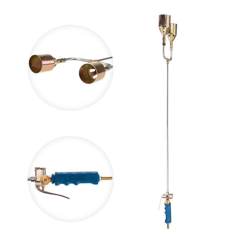 2 сопла выполнены из латуни для повышения срока службы инструмента и обеспечения температуростойкости. Сопла прогревают значительную площадь материала в короткий срок. С помощью вентиля легко регулировать длину пламени. Рычаг дежурного огня позволяет временно приостанавливать работы без повторного поджига газа.