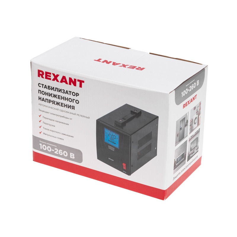 Однофазный стабилизатор переменного напряжения релейного типа марки REXANT предназначен для защиты бытовых и промышленных электроприборов от перепадов напряжения в сети и токов короткого замыкания. <br> При отклонении входного напряжения от нормы, устройство стабилизирует его, благодаря чему подключенное оборудование можно использовать, исключая опасность поломки. Рассчитан на диапазон входного напряжения от 140 до 260 В. При превышении предельных значений срабатывает аварийное отключение нагрузки. Выходное напряжение поддерживается на уровне 220±8% В.<br> На корпусе стабилизатора размещена индикация основных режимов работы, а также уровней напряжения на входе и выходе. Оснащен защитой от пониженного и повышенного напряжения, перегрева и токов короткого замыкания.