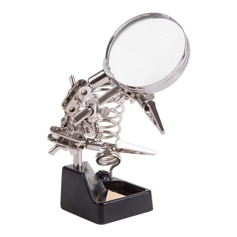 Инструмент состоит из чугунного основания (тяжелая подставка с нишей для губки, мелких деталей или припоя), шарнирного соединения с зажимами типа «крокодил» (подвижных во всех плоскостях) с никелевым покрытием, лупы с 2.5-кратным увеличением (возможность регулировки положения, диаметр линзы 60 мм) и спиралевидной подставки под паяльник.