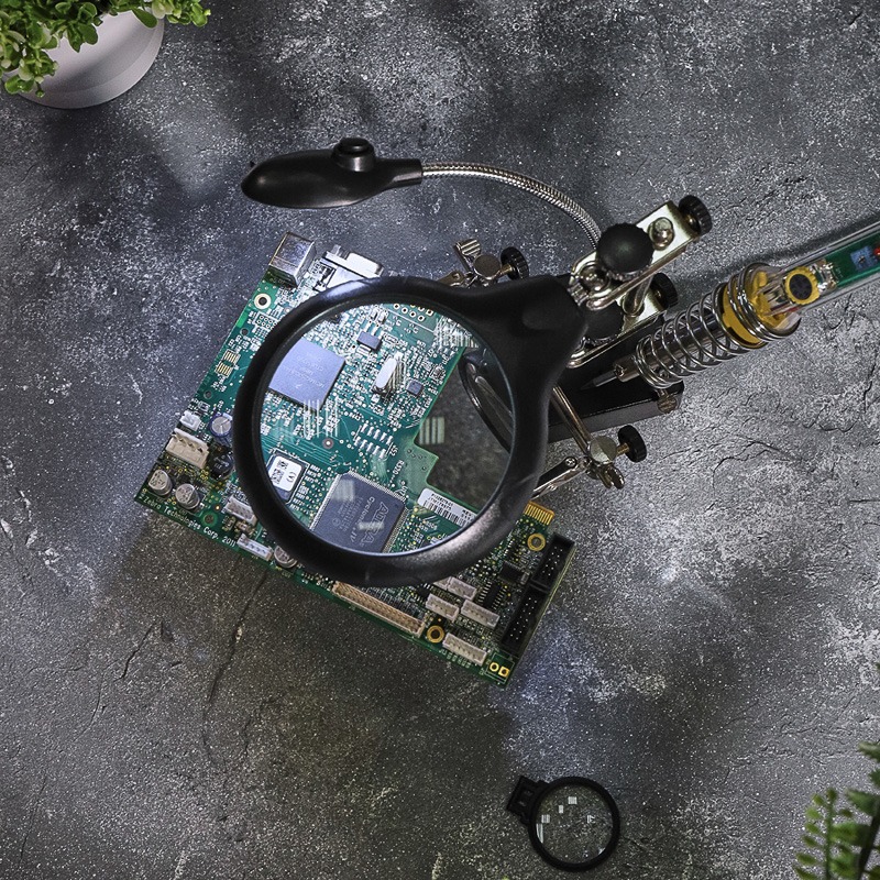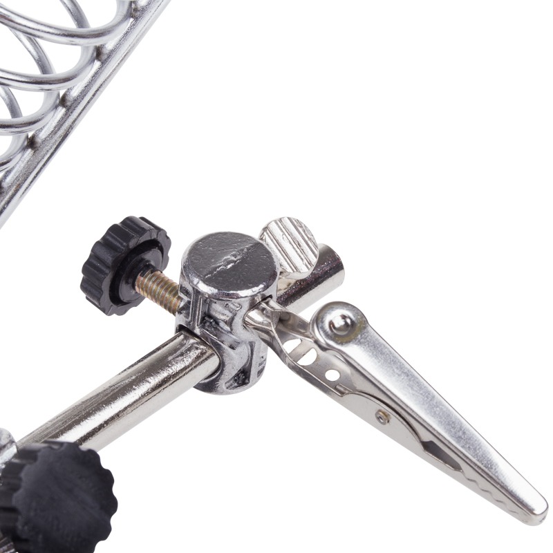 Держатель «третья рука» с лупой х2.5 + х7.5, подставка под паяльник, LED подсветка служит главным образом при проведении паяльно-сборочных работ в электронике, ювелирном деле, сборке и ремонте для зажима мелких деталей в любом нужном положении, когда не хватает двух рук. <br> Инструмент состоит из основания (подставка), шарнирного соединения с зажимами типа «крокодил» (подвижных во всех плоскостях, с никелевым покрытием), трёх луп с кратностью увеличения 2.5x (диаметр 90 мм), 7.5x (диаметр 34 мм) и 10x (диаметр 34мм), а также модуля подсветки. <br> В данной модели реализована подсветка от двух альтернативных источников: 3 батарейки типа АА (не поставляются в комплекте) и блока питания (в комплекте). <br> С помощью лупы можно будет рассмотреть даже самые мелкие детали.<br> <br> Размер в упаковке: 170 x 117 x 93 mm<br> Размер товара без упаковки в раскрытом виде: 245 x 198 x 120 mm