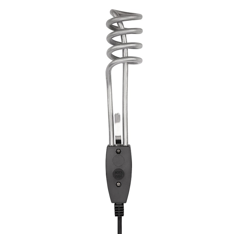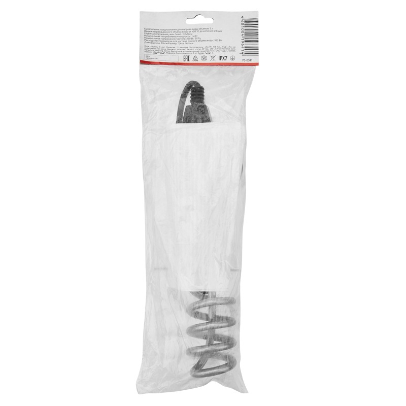 Электрический кипятильник REXANT мощностью 1000 Вт с нержавеющим нагревательным элементом разработан для нагрева и кипячения воды. Компактные размеры изделия занимают мало места, благодаря чему кипятильник удобно брать с собой в путешествия. Также он может пригодиться в домашних условиях, когда невозможно нагреть воду при помощи газовой плиты. Прибор состоит из нагревательного элемента (ТЭНа), термостойкой рукоятки, шнура питания с евровилкой и специального крючка для комфортной установки устройства в емкость с водой. Кипятильник предназначен для нагрева воды объемом 3 л.<br> Технические характеристики:<br> Время нагрева 3 л воды до кипения: 23 мин<br> Глубина погружения, мин./макс.: 14,5/16,5 см<br> Номинальная мощность: 1 кВт<br> Номинальное напряжение/частота: 230 В/50 Гц<br> Расход электроэнергии для нагрева данного объема воды: 392 Вт<br> Тип нагревательного элемента: закрытая спираль<br> Размер ТЭНа: 16,5 см
