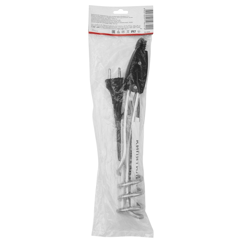 Электрический кипятильник REXANT мощностью 1500 Вт с нержавеющим нагревательным элементом разработан для нагрева и кипячения воды. Компактные размеры изделия занимают мало места, благодаря чему кипятильник удобно брать с собой в путешествия. Также он может пригодиться в домашних условиях, когда невозможно нагреть воду при помощи газовой плиты. Прибор состоит из нагревательного элемента (ТЭНа), термостойкой рукоятки, шнура питания с евровилкой и специального крючка для комфортной установки устройства в емкость с водой. Кипятильник предназначен для нагрева воды объемом 5,5 л.<br> Технические характеристики:<br> Время нагрева 5,5 л воды до кипения: 26 мин<br> Глубина погружения, мин./макс.: 17,5/19,5 см<br> Номинальная мощность: 1,5 кВт<br> Номинальное напряжение/частота: 230 В/50 Гц<br> Расход электроэнергии для нагрева данного объема воды: 750 Вт<br> Тип нагревательного элемента: закрытая спираль<br> Размер ТЭНа: 19,5 см