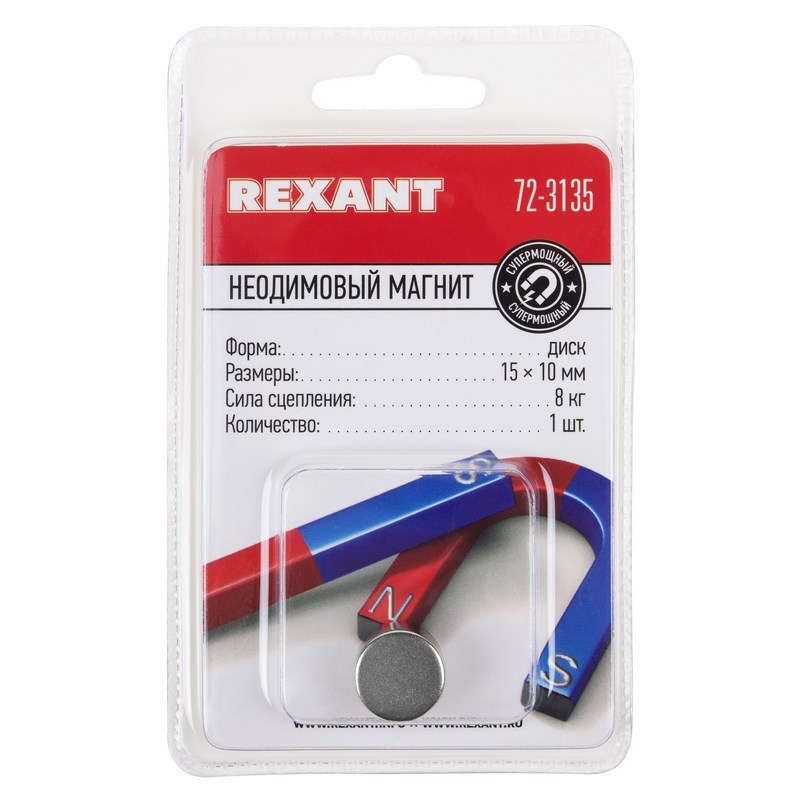 Постоянный редкоземельный неодимовый магнит REXANT состоит из сплава неодима, бора и железа. Известен своей мощностью притяжения и высокой стойкостью к размагничиванию. Применяется в различных областях промышленности, медицины, в быту и электронике.