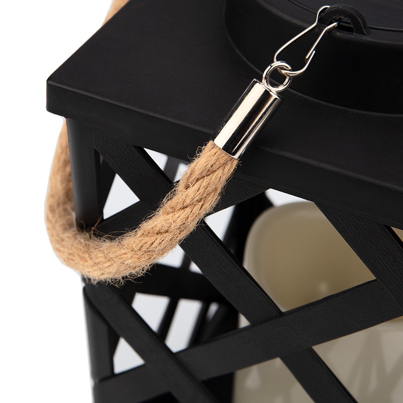 Декоративный фонарь со свечкой — оригинальное интерьерное украшение, которое принесет уют и тепло в ваш дом. Изделие предназначено для использования в интерьере. Декоративный элемент подсвечивается одним диодом, имитирующим теплое пламя свечи. Корпус черного цвета имеет высоту 24 см. Для размещения в подвешенном виде предусмотрено кольцо. Фонарь питается от 3 батареек типа ААА, специальный отсек закрывается при помощи крышки.