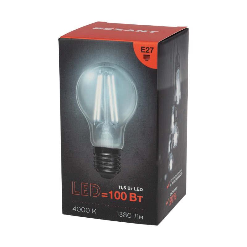 Лампа филаментная Груша A60 11,5Вт 1380Лм 4000K E27 прозрачная колба REXANT