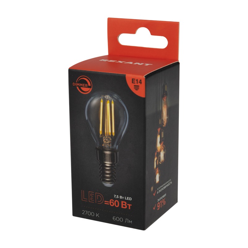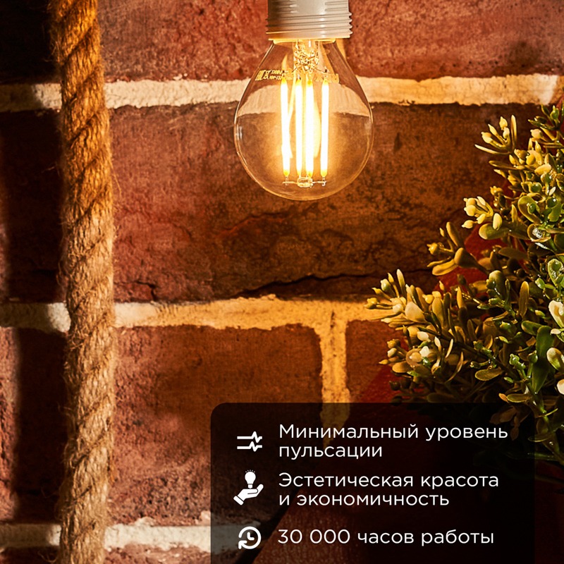 Филаментная лампа в форме шарика выступает как в качестве источника искусственного освещения, так и элемента декора. Благодаря компактным размерам лампы данного типа зачастую устанавливаются в небольшие люстры, настенные бра, маленькие настольные лампы или в другие осветительные приборы, для которых стандартная лампа слишком мала (выступает из-за плафона или не помещаться вовсе). <br> За счет распространения света во всех направлениях потребляет меньше электроэнергии при более высокой яркости. Благодаря наличию диммера яркость свечения лампы можно отрегулировать. <br> Также лампа равномерно распределяет температуру, благодаря чему не нагревается. Обладает мощностью в 7,5Вт и цоколем Е14.