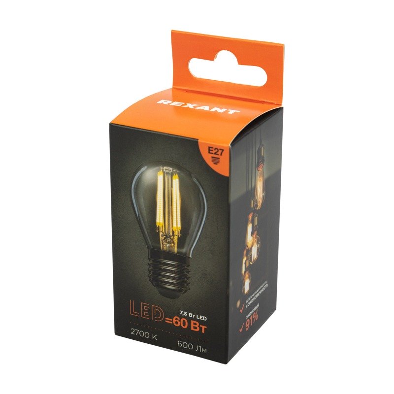 Лампа филаментная Шарик GL45 7,5Вт 600Лм 2700K E27 прозрачная колба REXANT