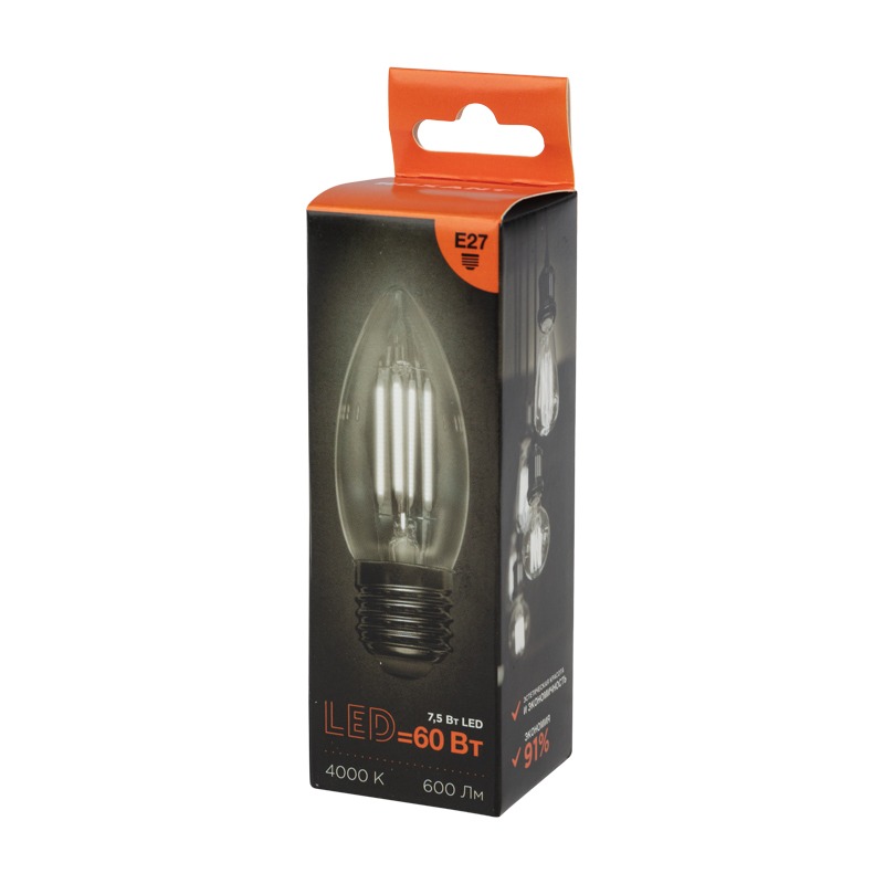 Филаментная лампа имеет форму, имитирующую пламя свечи, за счет чего и получила свое название. Обеспечивает качественное основное и дизайнерское освещение различных помещений. За счет распространения света во всех направлениях имеет широкий угол освещения и может быть установлена любым способом. <br> Стильный дизайн делает лампу отличным дополнением любого интерьера. Подходит как для отрытых, так и закрытых светильников. Прозрачная колба пропускает больше света и обеспечивает высокую яркость. <br> Обладает многими преимуществами: низкое энергопотребление, хорошее отведение тепла, долговечность, упрощенная утилизация и высокое качество. <br> Мощность лампы с цоколем Е27 составляет 7,5Вт.