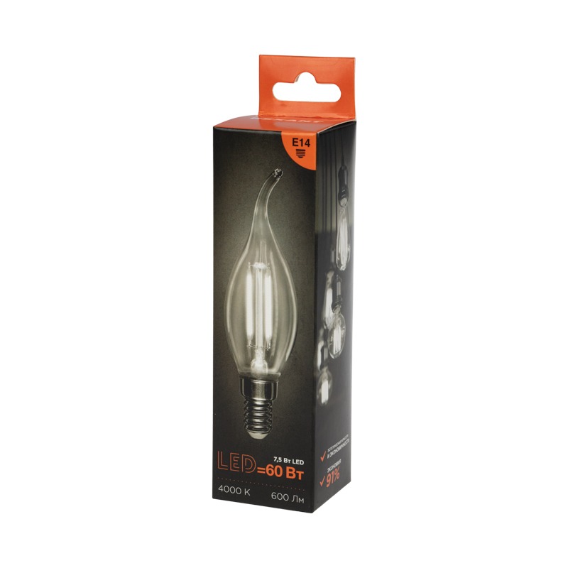 Филаментная лампа обладает характерной вытянутой формой с заостренным кончиком, напоминающим язык пламени на ветру. Имеет прозрачную колбу, которая пропускает больше света и обеспечивает высокую яркость. Мощность – 7,5Вт, цоколь – Е14.
