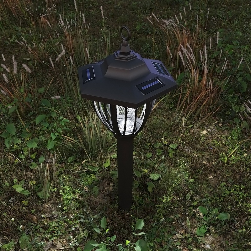 Антимоскитный садовый светильник сочетает сразу два устройства в одном: уничтожитель летающих насекомых и светильник для подсветки газонов, цветников и дорожек. Принцип действия электрического уничтожителя насекомых (комаров, мошкары) – основан на использовании ультрафиолетового излучения в специальном диапазоне (350-400 нм). Многие летающие насекомые весьма чувствительны к данному диапазону УФ-излучения и он привлекает их. Подлетая к лампе, насекомые замыкают собой прутья металлической решетки под напряжением и погибают от электрического разряда. Решетка защищена от случайного прикосновения, поэтому устройство безопасно для человека и домашних животных.