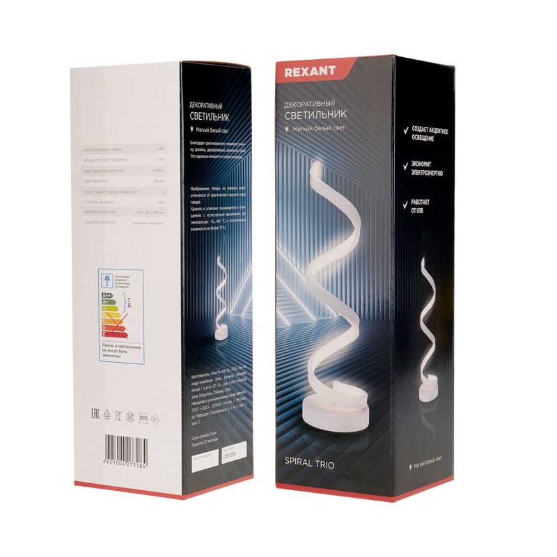Декоративный настольный светильник Spiral, выполненный в современном дизайне, станет элегантным дополнением интерьера в стиле модерн или хай-тек. Изящная форма и теплое свечение создадут в комнате особенную и чарующую атмосферу. <br> Светильник подойдет для акцентного освещения в спальне, гостиной или кабинете.<br> <br> Характеристики:<br> Тип источника света: LED<br> Мощность светильника: 2 Вт<br> Напряжение питания: 5В<br> Цветовая температура: 3000 К<br> Габаритные размеры: 125x125x400 мм<br> Цвет корпуса: белый<br> Степень защиты: IP20<br> Класс энергоэффективности: A<br> Класс защиты от поражения электрическим током: III