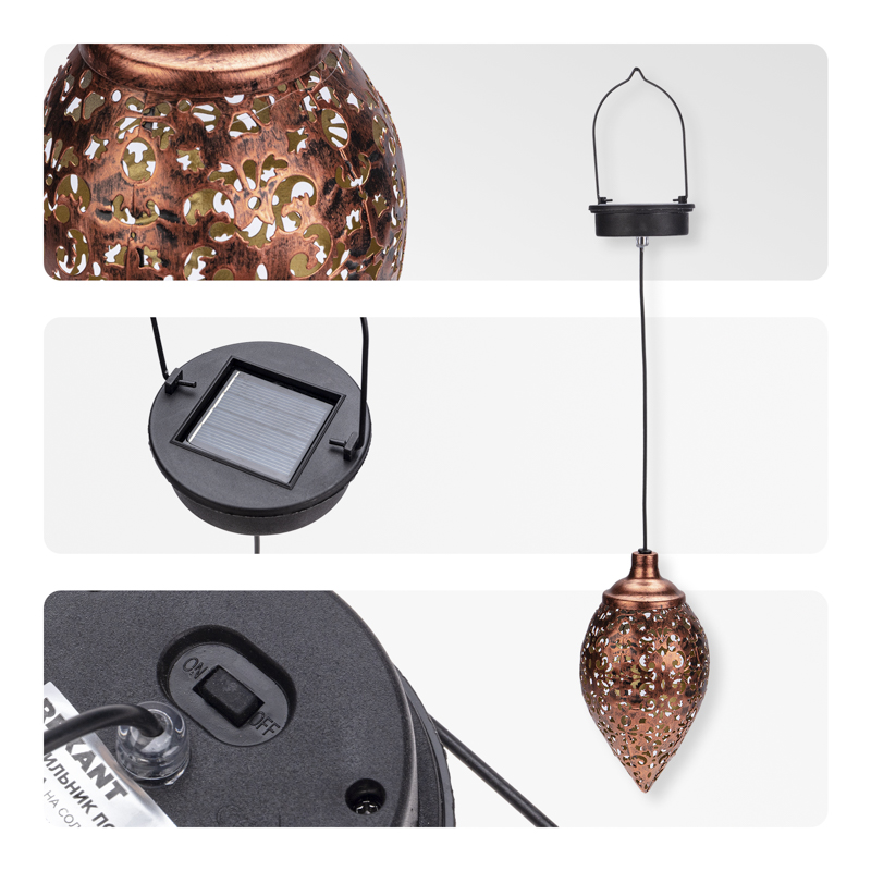 Накопленная энергия хранится во встроенном аккумуляторе, что позволяет светильнику автономно функционировать около 6-8 часов и освещать окружающую территорию вечером и ночью, не требуя подключения к электросети. Подвесной светильник Фатих – это изысканный элемент садового декора, предназначенный для создания дополнительного освещения или акцентной подсветки. Может быть размещен в беседках, на верандах, деревьях, арках, а также на садовых скульптурах или инсталляциях.