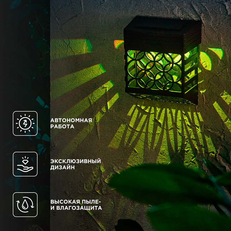 Изделие оснащено солнечной панелью, которая поглощает солнечные лучи в течение дня и преобразует их в электрическую энергию. Накопленная энергия хранится во встроенном аккумуляторе, что позволяет светильнику автономно функционировать около 6-8 часов. Светильник Ковэнт – это изысканный элемент садового декора, предназначенный для создания дополнительного освещения или акцентной подсветки. Изделие может быть размещено на фасаде дома, на стенах террасы, веранды, около входной двери на участок, а также на столбе, заборе или каком-либо ограждении.