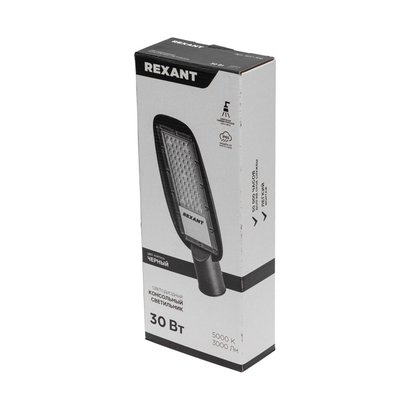 Светодиодный консольный светильник REXANT подходит для освещения автостоянок, площадей, парков, коттеджных поселков, железнодорожных платформ, станций, мостов, территорий дворов, школ, пешеходных и велодорожек. <br> Множество долговечных светодиодов с мягким белым свечением создают эффект дневного освещения. <br> Обеспечивает оптимальный теплоотвод, а обтекаемая форма светильника создает более высокую ветрозащиту и меньшую нагрузку на опору. <br> Система предотвращения самопроизвольного ослабления резьбовых соединений обеспечивает высокую устойчивость к вибрациям.<br> <br> Тип светильника: уличный консольный светильник<br> Номинальная частота: 50/60 Гц<br> Диапазон рабочих напряжений: AC 85-265 В<br> Рабочее выходное напряжение: DC 70-80 В<br> Коэффициент мощности: ≧0.9<br> Рабочий ток: 300 mA ±10%<br> Номинальная мощность: 30 Вт<br> Световой поток: 3000 Лм<br> Коррелированная цветовая температура свечения: 5000 К<br> Индекс цветопередачи: 80 Ra<br> Угол светового потока: 140° / 70°<br> Коэффициент пульсации: 100%<br> Тип источника питания: встроенный изолированный<br> Тип источника света: SMD3030LED<br> Количество светодиодов: 60<br> Материал корпуса: литой алюминий<br> Цвет корпуса: черный<br> Материал рассеивателя: поликарбонат (PC)<br> Степени защиты, обеспечиваемые оболочками (Код IP): IP65<br> Степени защиты, обеспечиваемой оболочками от наружного механического удара (код IK): IK08<br> Класс защиты от поражения электрическим током: I<br> Диапазон рабочих температур: -40...+50 ℃<br> Диаметр посадочного отверстия: 50 мм<br> Высота монтажа (метры) минимум-максимум: `2-3<br> Расчетная площадь освещения: 30 м²<br> Высота: 362 мм<br> Ширина: 62 мм<br> Длина: 145 мм<br> Вес: 0,62 кг<br> Срок службы: 50000 ч
