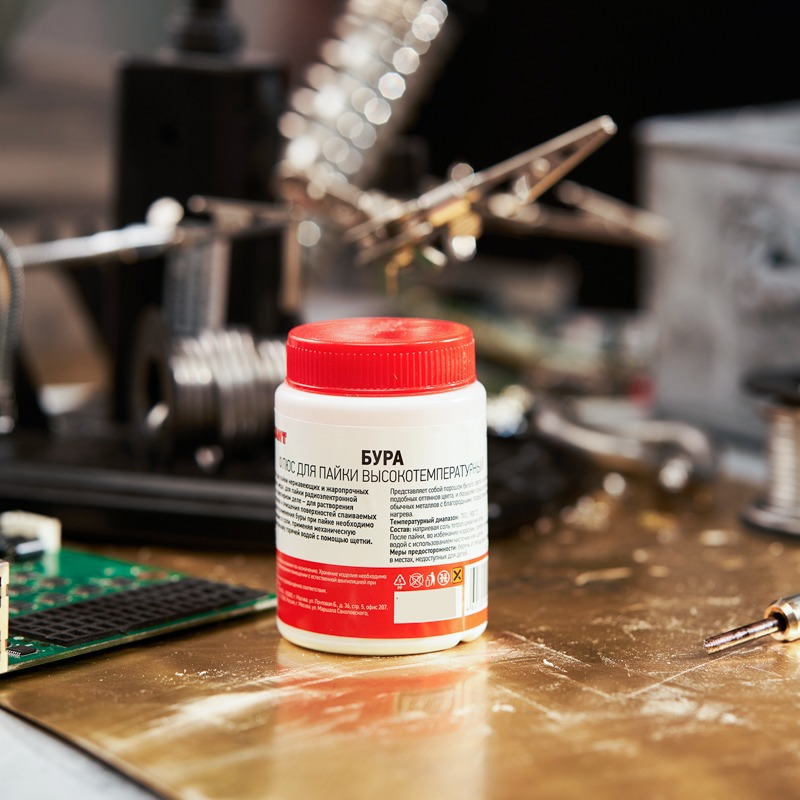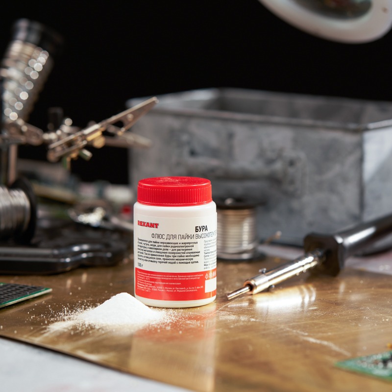 Флюс для пайки БУРА REXANT применяется для пайки нержавеющих и жаропрочных сталей, чугуна и меди. Также используется в ювелирном деле для растворения окислов металлов и очищения поверхностей спаиваемых деталей, а также при пайке ювелирных украшений из золота, серебра, мельхиора.