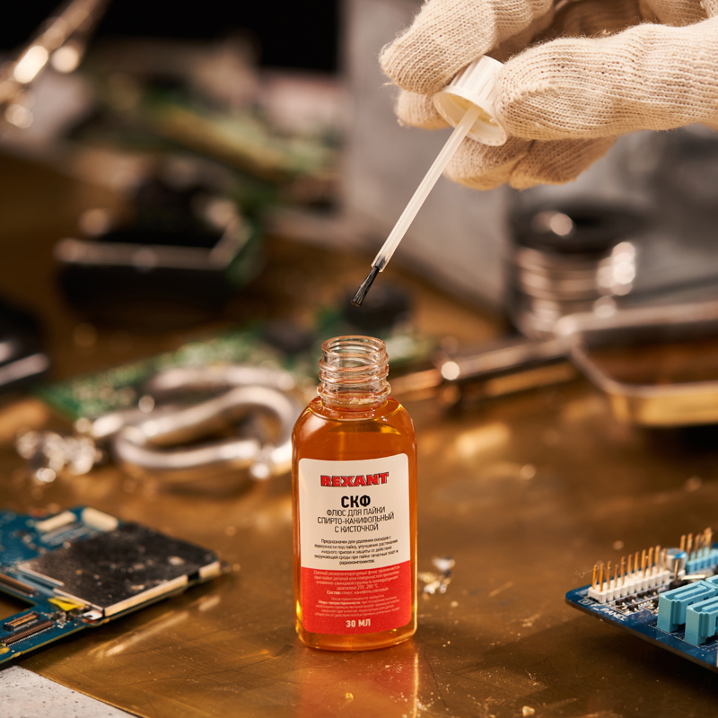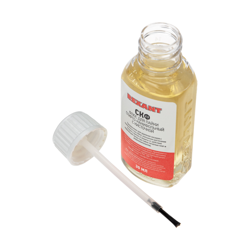 Основные компоненты: хлорид цинка и вода. Вариант фасовки – флакон объемом 30 мл. Крышка оснащена кисточкой для удобного нанесения. Флюс СКФ (спирто-канифольный) REXANT предназначен для удаления оксидов с поверхности под пайку, улучшения растекания жидкого припоя и защиты от действия окружающей среды при пайке печатных плат и радиокомпонентов. Наиболее эффективен при работе с медью и ее сплавами. Изготовлен в соответствии с ОСТ 4Г 0.033.200. Часто используется для ремонта радиоаппаратуры.