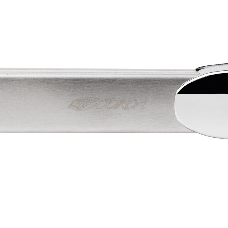 Ручка выполнена из термопластичной резины. Она удобно лежит в руке и позволяет легко применять при приготовлении на огне, не боясь обжечься. Размер изделия: 445х40х1,5 мм.