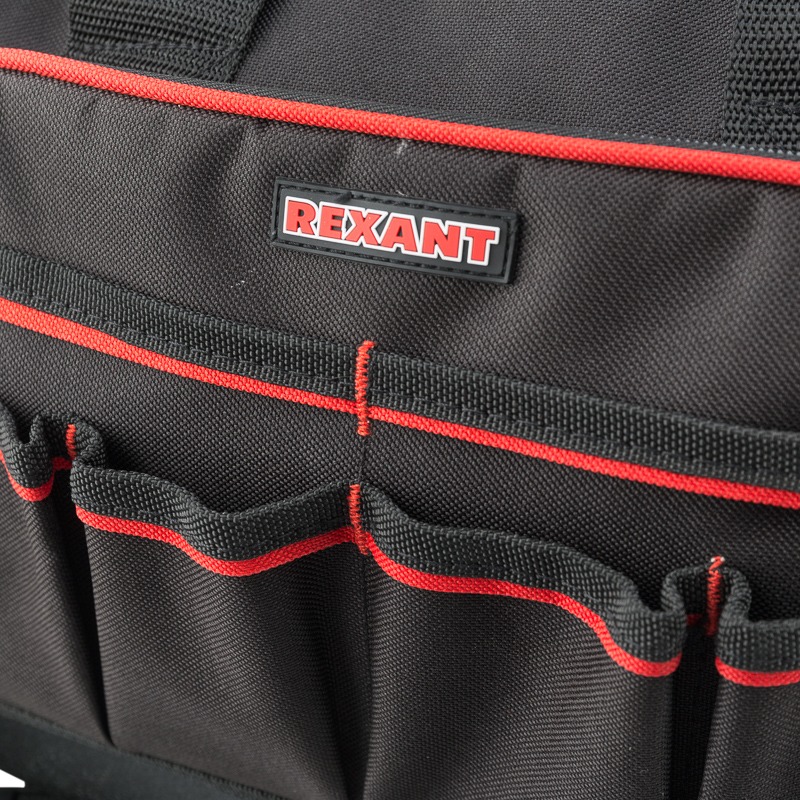 Сумка монтажника REXANT RE-25 оснащена 25 карманами и предназначена для комфортной транспортировки инструментов. Выполнена из водонепроницаемого комбинированного материала, пропитанного полиуретановым составом и поливинилхлоридом, который используют в изготовлении тентов для шатров, торговых палаток и различного снаряжения для туристических поездок.<br> <br> Характеристики:<br> Габариты: 32.5х22.5х30 см<br> Материал: ткань «Оксфорд» 600D PVC PU<br> Максимальный выдерживаемый вес: до 15 кг<br> Вес рюкзака: 1 кг<br> Цвет: черный, красный<br> <br> Преимущества:<br> Прошитые мягкие ручки обеспечивают комфорт при переноске<br> Ремень с резиновым наплечником и металлическими карабинами<br> Металлические кольца для крепления плечевого ремня<br> Усиленная молния с крупными звеньями<br> Прочное пластиковое дно
