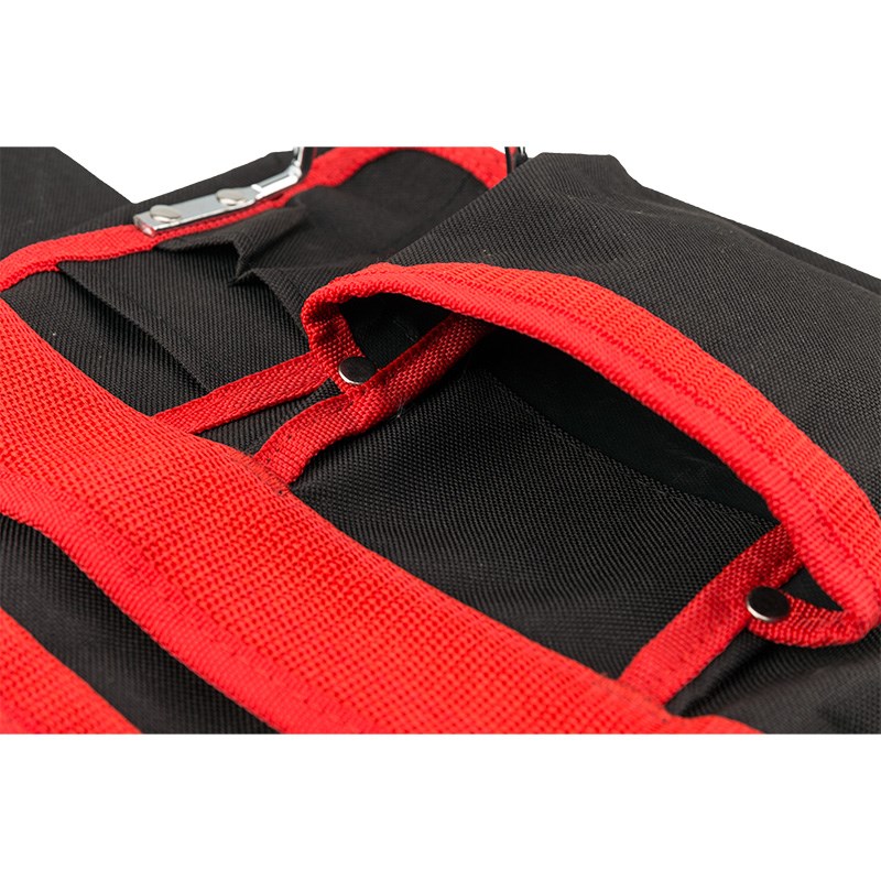 Сумка монтажника REXANT RE-25 оснащена 25 карманами и предназначена для комфортной транспортировки инструментов. Выполнена из водонепроницаемого комбинированного материала, пропитанного полиуретановым составом и поливинилхлоридом, который используют в изготовлении тентов для шатров, торговых палаток и различного снаряжения для туристических поездок.<br> <br> Характеристики:<br> Габариты: 32.5х22.5х30 см<br> Материал: ткань «Оксфорд» 600D PVC PU<br> Максимальный выдерживаемый вес: до 15 кг<br> Вес рюкзака: 1 кг<br> Цвет: черный, красный<br> <br> Преимущества:<br> Прошитые мягкие ручки обеспечивают комфорт при переноске<br> Ремень с резиновым наплечником и металлическими карабинами<br> Металлические кольца для крепления плечевого ремня<br> Усиленная молния с крупными звеньями<br> Прочное пластиковое дно