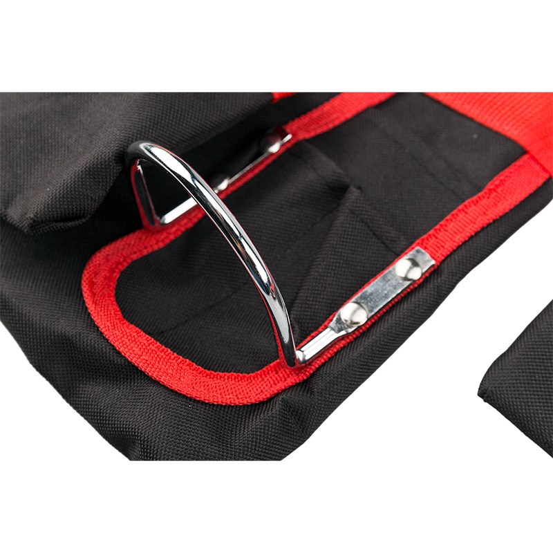 Сумка-пояс монтажника REXANT RE-15 оснащена 15 карманами и предназначена для комфортной транспортировки инструментов. Выполнена из водонепроницаемого комбинированного материала, пропитанного полиуретановым составом и поливинилхлоридом, который используют в изготовлении тентов для шатров, торговых палаток и различного снаряжения для туристических поездок. Надежные металлические элементы обладают длительным сроком службы.<br> <br> Характеристики:<br> Габариты: 60х30 см<br> Длина пояса: 130 см<br> Материал: ткань «Оксфорд» 600D PVC PU<br> Максимальный выдерживаемый вес: до 10 кг<br> Вес рюкзака: 0.5 кг<br> Цвет: черный, красный<br> <br> Преимущества:<br> 2 симметричных больших подсумника, на каждом расположены карманы в количестве 15 штук<br> 1 внутреннее отделение<br> Прочный двухрядный полипропиленовый пояс с мощной металлической пряжкой<br> Сумки закреплены на поясе металлическими заклепками