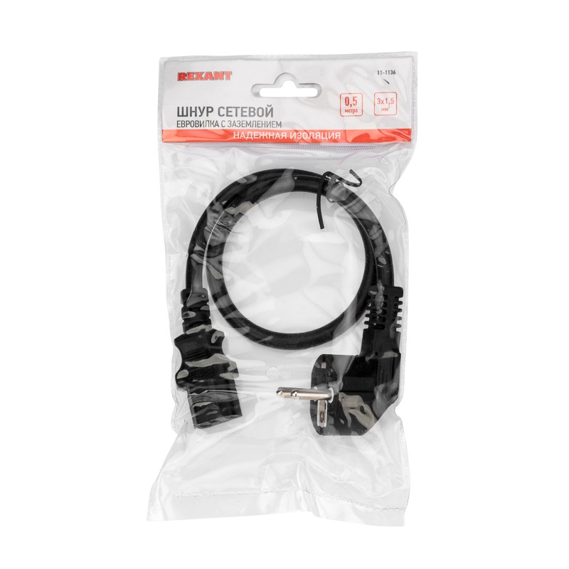 Шнур сетевой, евровилка угловая - евроразъем С13, кабель 3x1,5 мм², длина 0,5 метра, черный (PVC пакет) REXANT