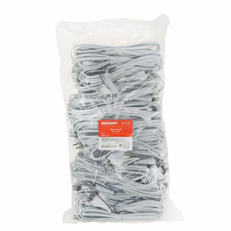 Шнур сетевой 1.8 м без розетки белый REXANT предназначен для подключения к сети переменного тока (AC) с напряжением 220 B электроприборов напрямую (скруткой или клеммным соединителем), без использования розетки. Данный шнур состоит из двухжильного провода с сечением жил 0.5 мм², с одной стороны литой неразборной плоской вилки (евро), с другой — подготовленных (зачищенных и облуженных оловом) проводников.