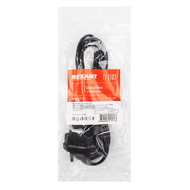 Шнур сетевой (угловая вилка) 2x0.5 мм² 1.5 м REXANT предназначен для подключения к сети переменного тока (AC) с напряжением 220 B аудио- и видеоаппаратуры, источников питания ноутбуков, игровых консолей и других приборов, имеющих штыревой сетевой разъем типа С8 (известен из-за его формы как «восьмерка»). Данный сетевой шнур (IEC cord) состоит из двухжильного провода с сечением жил 0.5 мм², с одной стороны угловой литой плоской вилки (евро) и с другой — литого гнездового неполяризованного разъема типа C7 (евроразъем).