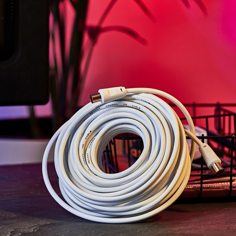 Шнур TV PLUG - TV JACK 15 м белый REXANT предназначен для передачи аналоговых аудио- и видеосигнала телевизионной сети к телевизору при подключении к телевизионной розетке, для подключения различного телекоммуникационного оборудования (ресиверы, ТВ-приставки и т. д.). Его также можно используют в качестве удлинителя высокочастотного кабеля для передачи ТВ сигнала от телевизионной антенны. C одной стороны шнура располагается штекер TV разъема, с другой — гнездо TV разъема.