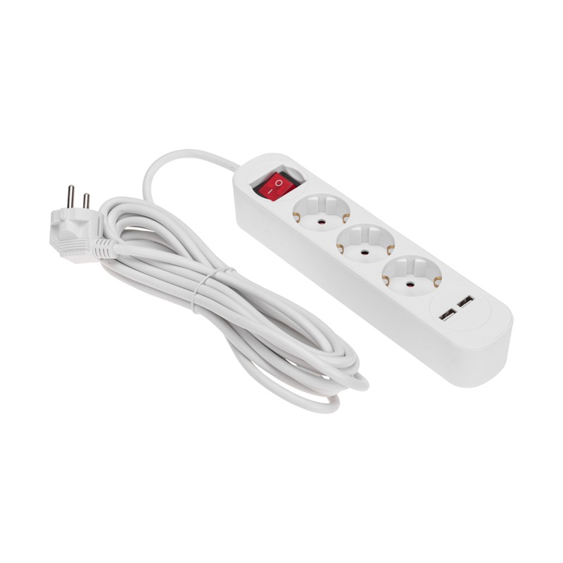 Удлинитель REXANT предназначен для подключения электрических приборов, когда недостаточно стандартной длины шнура для питания от стационарных розеток. <br> Наличие 3 гнезд позволяет одновременно подключить несколько электроприборов. Каждое гнездо имеет заземление, что гарантирует безопасность при использовании.<br> Универсальные розетки обеспечивают возможность подключения вилок как российского, так и европейского стандарта. Также предусмотрено два USB разъема. <br> Удлинитель оснащен защитными шторками, которые предназначены для предотвращения случайного попадания пыли, влаги или посторонних предметов в гнезда удлинителя, что способствует долговечности самого устройства и подключенных к нему приборов, а также обеспечивает защиту от поражения электрическим током.<br> На корпусе устройства располагается выключатель, который позволяет при необходимости легко выключить или выключить все устройства одновременно.<br> Мощность – 3500Вт. Сечение провода – 3х1,0мм². Тип вилки – угловая. Цвет удлинителя – белый.