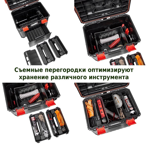 • Большая вместимость, позволяющая транспортировать самые тяжелые инструменты