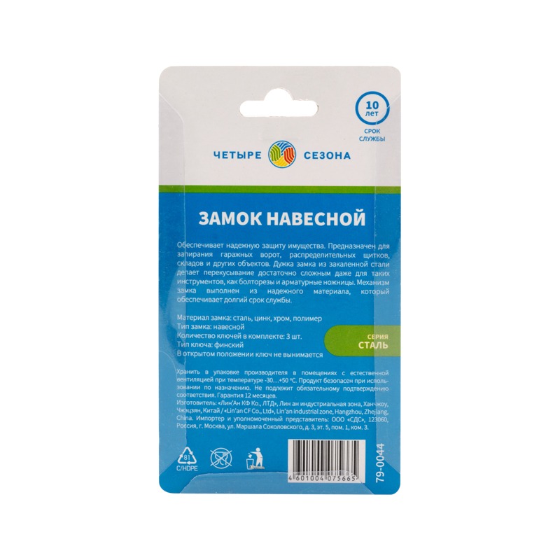 Навесной замок ЧЕТЫРЕ СЕЗОНА идеально подходит для защиты вашего имущества от непрошенных гостей. Замок пригодится для запирания гаражных ворот, распределительных щитков, складов и других объектов.