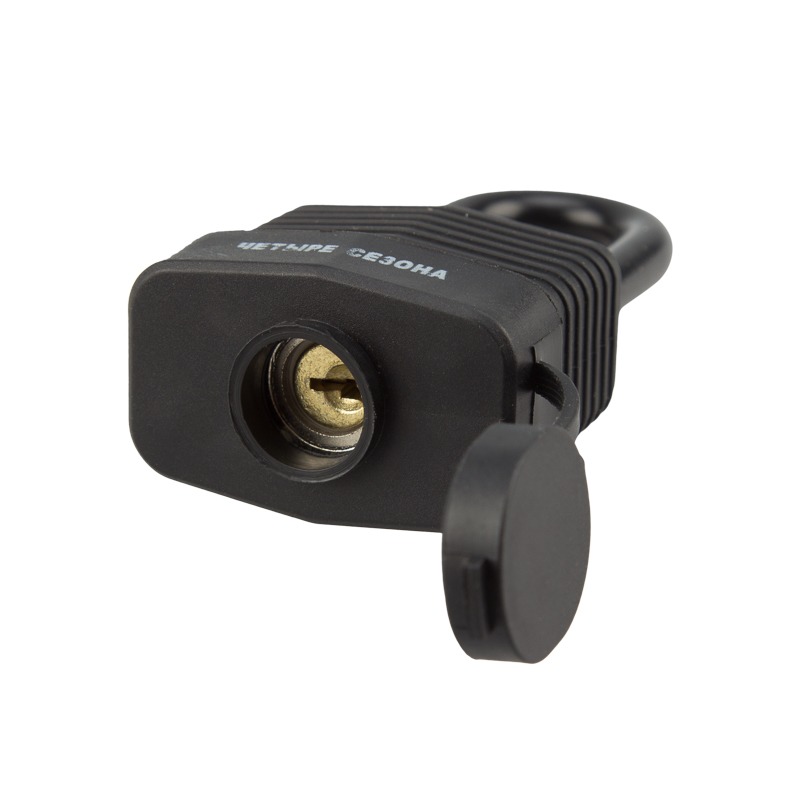 Специальная прорезиненная оболочка препятствует проникновению влаги внурь механизмов замка. Длинная дужка позволяет устанавливать замок в труднодоступных местах