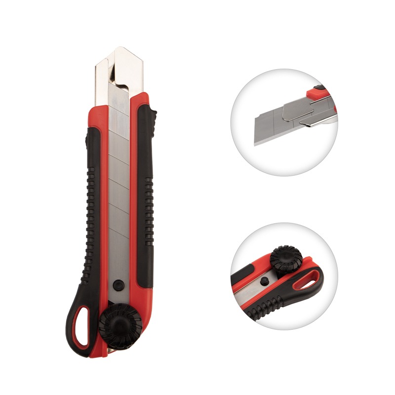 Прочный корпус инструмента из ABS-пластика обладает удобной обрезиненной рукояткой, что увеличивает его эксплуатационные свойства. Стальное лезвие фиксируется автоматически, также предусмотрен дополнительный замок. Когда крайний сегмент затупляется, его можно отломить и продолжить использовать инструмент. Качественные материалы обеспечивают долгий срок службы инструмента.