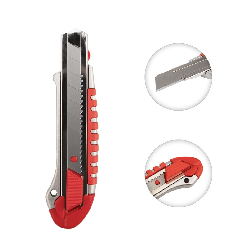 Прочный металлический корпус инструмента обладает удобной обрезиненной рукояткой, что увеличивает его эксплуатационные свойства. Стальное лезвие фиксируется автоматически, также предусмотрен дополнительный замок. Когда крайний сегмент затупляется, его можно отломить и продолжить использование инструмента Качественные материалы обеспечивают долговечное использование.