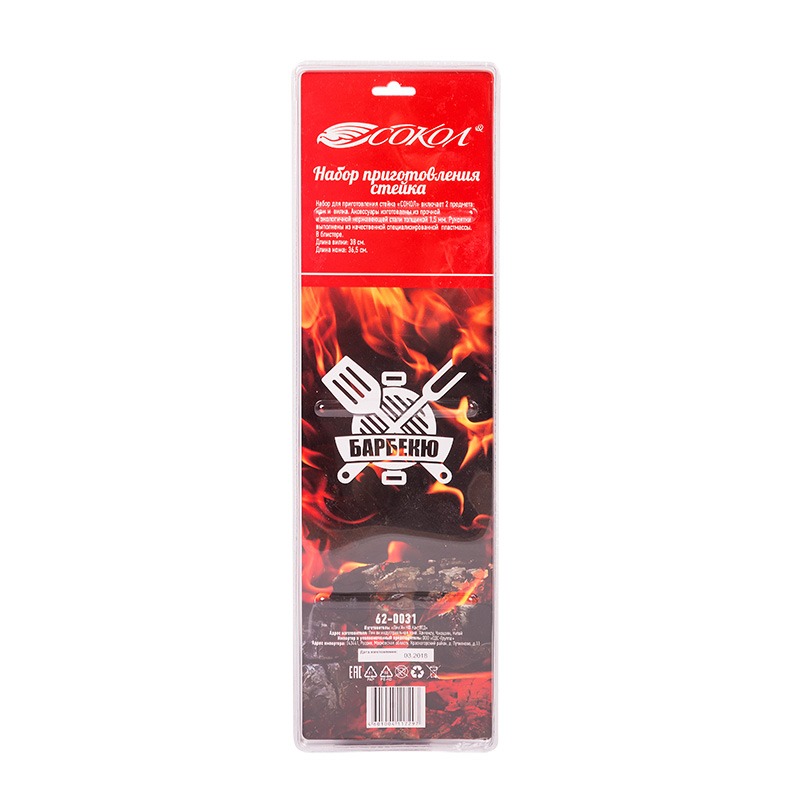 Набор аксессуаров для приготовления стейка СОКОЛ состоит из 2 предметов: вилки 38 см и ножа 36,5 см. Оптимальная длина изделий предохраняет руки от случайных ожогов. <br> Вилкой удобно переворачивать и снимать мясо, птицу, рыбу с решетки гриль. Благодаря специальной конструкции, вилка помогает переместить еду, не нарушив ее форму, тем самым сохраняет эстетичный вид для подачи блюда. Нож для стейка обладает тонким узким лезвием и не деформирует готовое мясо. <br> Аксессуары выполнены из прочной и экологичной нержавеющей стали, благодаря чему выдерживают большие перепады температур и устойчивы к коррозии. <br> Эргономичные рукоятки из специализированной пластмассы не позволяют изделиям скользить в руке в процессе готовки.