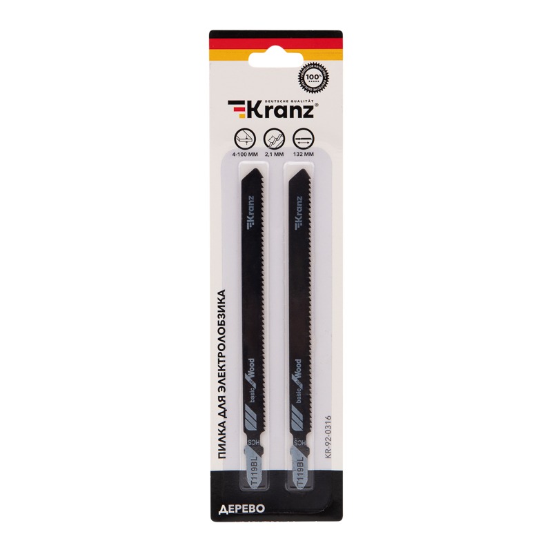Пилка для электролобзика по дереву T119BL 132 мм 12 зубьев на дюйм 4-100 мм (2 шт. /уп. ) Kranz