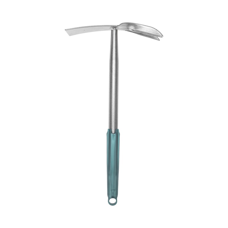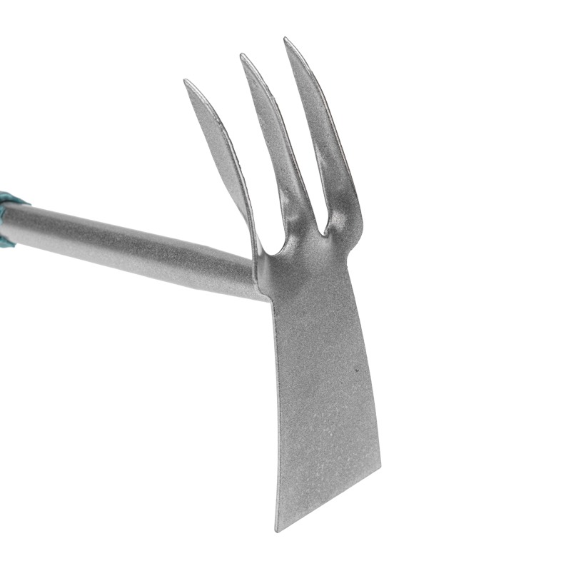 Мотыжка используется при выполнении работ в садах, огородах, цветниках и т.д. Применяется для рыхления почвы, формирования рядов для посева, прополки сорняков и многого другого.<br> Рабочая часть и рукоятка выполнены из метала с порошковым покрытием, благодаря чему грабли обладают долговечностью, прочностью и надежностью. Конструктивно рабочая часть состоит из лопатки и 3 витых зубцов. <br> Cверху рукоятка покрыта пластиком, что препятствует скольжению инструмента в руке и создает комфорт при выполнении работ.<br> Также в рукоятке предусмотрено отверстие, позволяющее размещать мотыжку на вертикальных поверхностях, что обеспечивает удобство хранения и позволяет экономить место на рабочем пространстве.