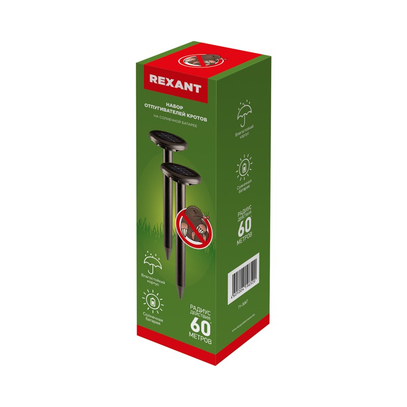 Ультразвуковой отпугиватель на солнечной батарее REXANT предназначен для борьбы с земляными вредителями, такими как: кроты, землеройки, полевые мыши, медведки, змеи.
