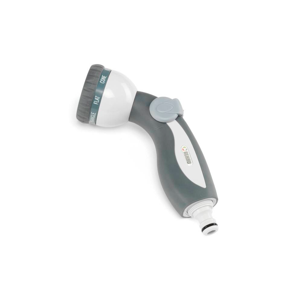 Имеет 8 различных режимов струи воды. Регулировка напора воды осуществляется с помощью большого пальца при помощи удобного переключателя на рукоятке разбрызгивателя. Благодаря использованию специального противоскользящего пластика (soft grip) на рукоятке разбрызгиватель не выскальзывает из рук в процессе работы.