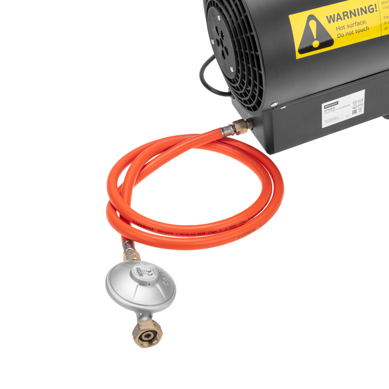 В комплект входит шланг длиной 1,5 м и переходник, что обеспечивает удобство подключения к газовому баллону или другому источнику газа.