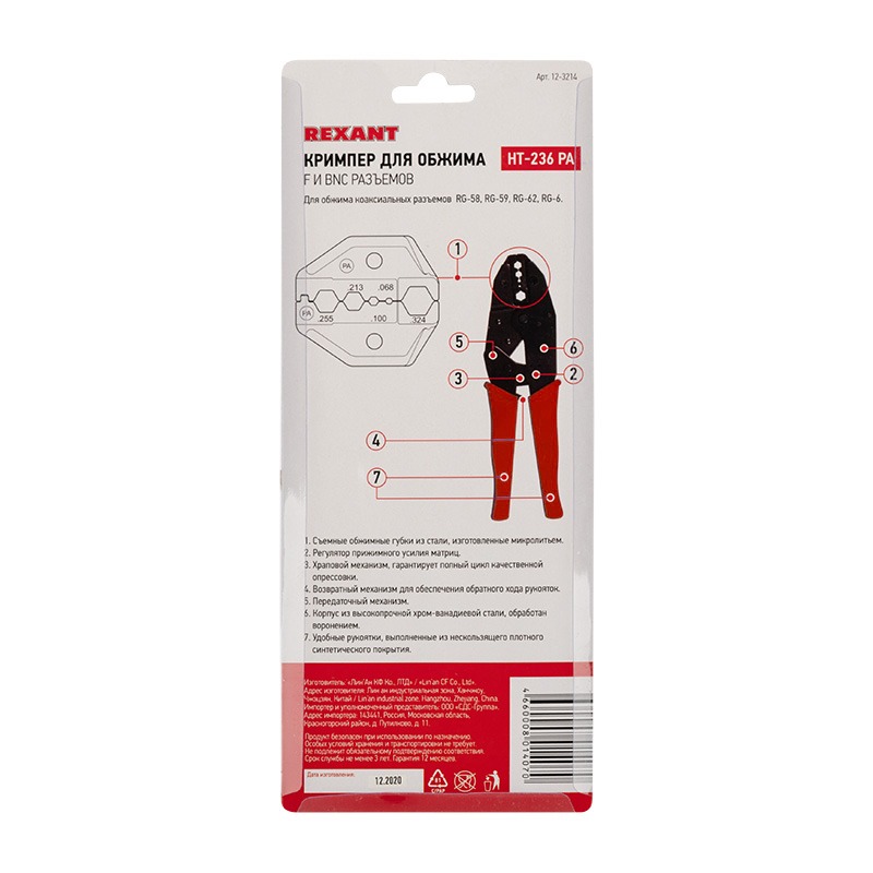 Кримпер REXANT HT-301 PA для обжима F и BNC разъемов RG-58, RG-59, RG-62, RG-6