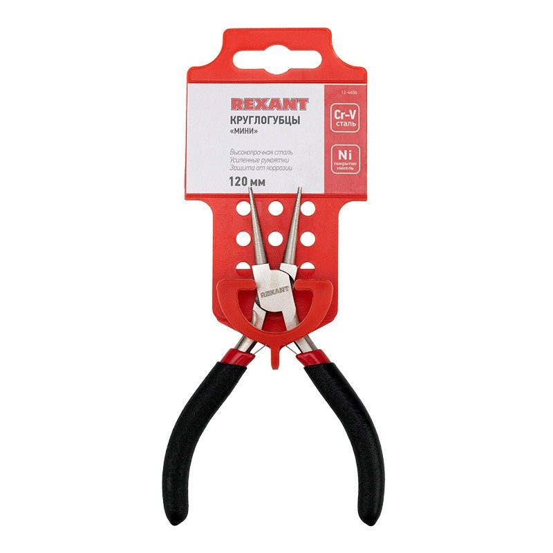 Круглогубцы REXANT Мини применяются для проведения точных работ, захвата и сгибания проволоки, металлической жилы, прутка. <br> Высокое качество хромованадиевой стали, из которой изготовлены круглогубцы, сохраняет их в рабочем состоянии долгие годы. Оксидированное никелевое покрытие продлевает срок службы, защищая инструмент от поражения коррозией.<br> Благодаря закаленной кромке круглогубцы имеют повышенную прочность и высокую износоустойчивость.<br> Облегченные рукоятки, изолированные ПВХ-оплеткой, не скользят в руках. <br> Функция авторазжима возвращает губки в изначальное положение, что экономит время и силы во время работы. Благодаря небольшим размерам с помощью инструмента удобно выполнять работу в труднодоступных местах.