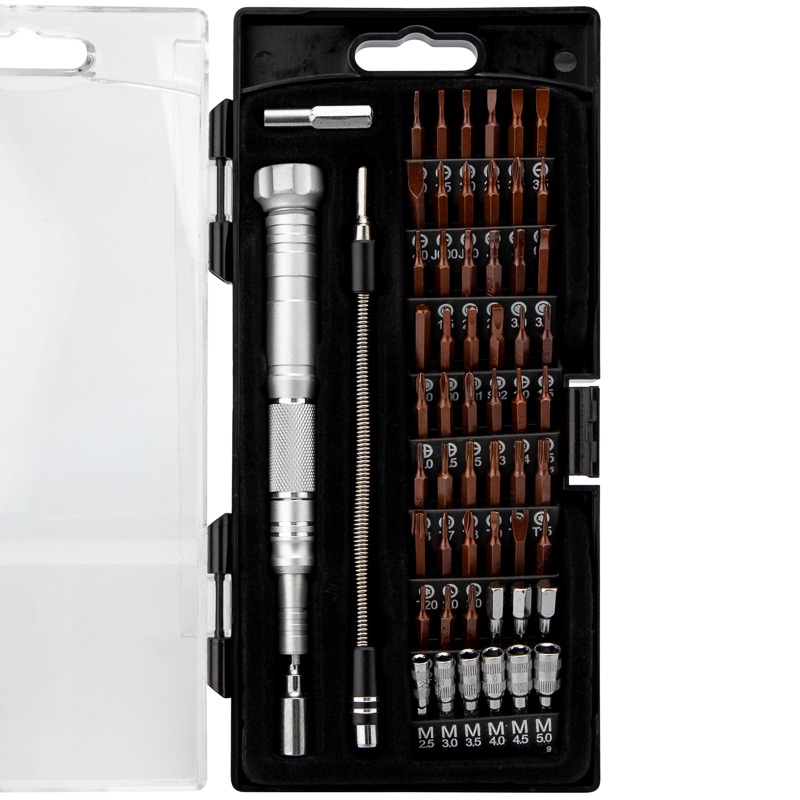 Набор отверток для точных работ REXANT 45 в 1 оптимально подходит для выполнения прецизионных работ в электронике и электромеханике, ремонта телефонов, планшетов, ноутбуков, электронных книг, часов и других популярных приборов, которые используются в быту. Инструменты выполнены из качественной хромованадиевой стали, обладающей высокой прочностью к механическим повреждениям и образованию ржавчины. <br> Прорезиненная двухкомпонентная пластиковая рукоятка не скользит в ладони и обеспечивает дополнительный комфорт при работе. Вращающаяся шляпка позволяет производить прокручивание инструмента только пальцами без постоянного перемещения руки.<br> Цанговый зажим обеспечивает быструю замену и надежную фиксацию насадок. Пинцет с изогнутыми острыми губками помогает работать с мелкими деталями. Набор инструментов и бит поставляется в пластиковом кейсе для удобного хранения и транспортировки. <br> <br> Характеристики:<br> Биты: Т3, Т4, Т5, Т6, Т7, Т8, Т9, Т10, Т15, Т20;<br> H0.9, H1.3, H1.5, H2.0, H2.5, H3.0, H4.0;<br> SL1.0, SL1.5, SL 2.0, SL 2.5, SL3.0, SL3.5, SL4.0;<br> М2.5, М3, М3.5, М4, М5, М5.5;<br> PHOOO, PHOO, PH0, PH1, PH2;<br> Υ0, Υ1, Υ0.8;<br> U2.6;<br> Pentalobe 0.8;<br> ▲ (Triangle) 3.0;<br> ʘ (аналог скрепки для слота SIM-карты) 1.5;<br> Отвертка: да;<br> Пинцет: да;<br> Гибкий удлинитель: да;<br> Посадка бит: 1/8;<br> Материал насадок: хромованадиевая сталь;<br> Материал пинцета: нержавеющая сталь AISI 304;<br> Материал кейса: ABS-пластик.