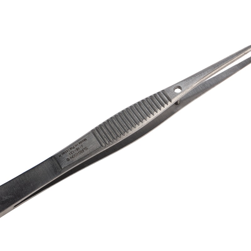 Пинцет прямой, узкий, фиксатор, рифленый 100мм ПРОФИ