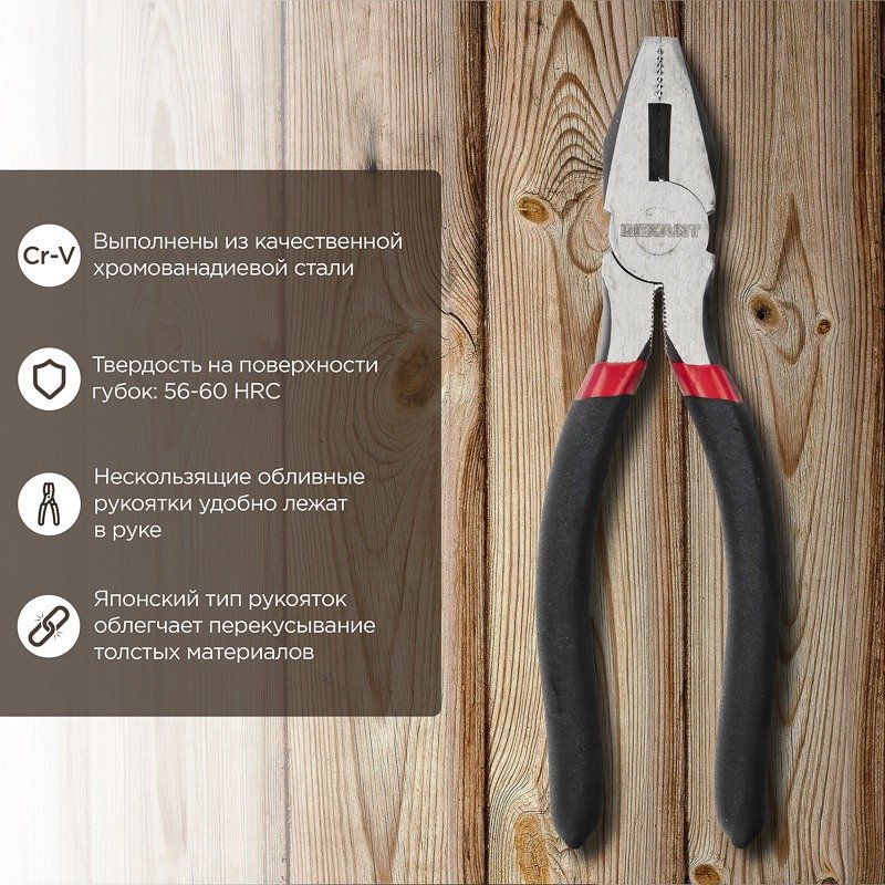 Плоскогубцы комбинированные REXANT используются для точных работ и монтажа цепей слабого тока. Подходят как для профессионального, так и для бытового применения.<br> Материал изготовления – хромованадиевая сталь, высокое качество которой сохраняет инструмент в рабочем состоянии долгие годы. Оксидированное никелевое покрытие продлевает срок службы, защищая инструмент от поражения коррозией.<br> Закаленная режущая кромка необходима для разделения проволоки и крепежа. Выемки предусмотрены для захвата цилиндрических деталей: прутьев, толстой проволоки, гвоздей, шурупов. Рукоятки из пластика оснащены резиновыми вставками, благодаря чему не скользят в ладони.