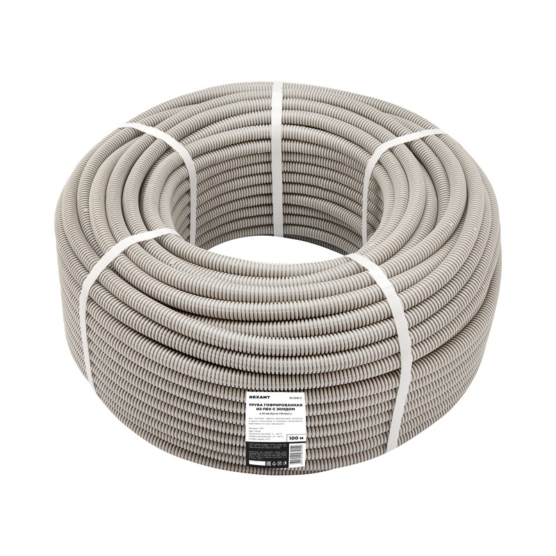 Труба гофрированная из ПВХ с зондом Ø 20 мм (бухта 100 м/уп.) REXANT предназначена для одиночной прокладки в них скрытым, полускрытым и открытым способами в стационарных электроустановках бытового и аналогичного назначения, эксплуатируемых как внутри помещений, так и на открытом воздухе электрических, телефонных, компьютерных и телевизионных сетей. Работающих при электрическом напряжении постоянного или переменного тока величиной не более 1000 Вольт.