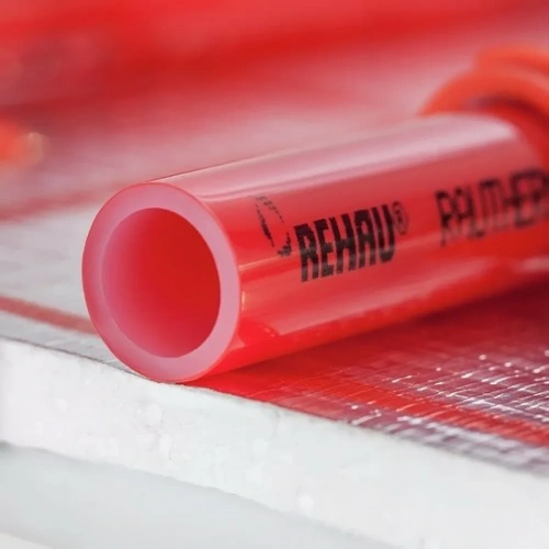 REHAU RAUTHERM S - серия труб разработанная специально для водяных теплых водяных полов. Труба характерного красного цвета из сшитого полиэтилена PE-Xa c кислородозащитным слоем, способна выдержать температуру жидкости до 90°С и давление до 6 бар.