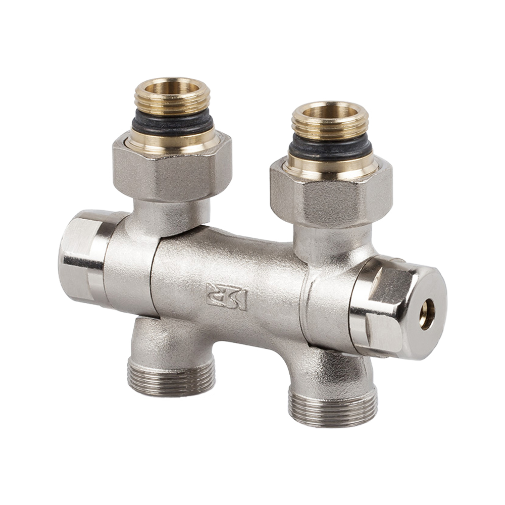 Группа Free Style SR Rubinetterie , двойной запорный клапан, межосевое расстояние 50 мм для одно/двухтрубных систем с ориентируемыми соединениями (для отвода в пол или стену), пошаговая регулировка by-pass, сменное соединение для медных и многослойных труб.